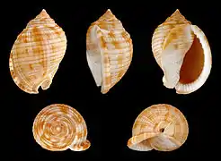 | Five views of a shell of Semicassis granulata | |