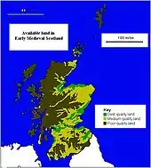 Lacking the urban centres created under the Romans in the rest of Britain, the economy of Scotland in the early Middle Ages was overwhelmingly agricultural. Without significant transport links and wider markets, most farms had to produce a self-sufficient diet of meat, dairy products and cereals, supplemented by hunter-gathering. Limited archaeological evidence indicates that throughout Northern Britain farming was based around a single homestead or a small cluster of three or four homes, each probably containing a nuclear family, with relationships likely to be common among neighbouring houses and settlements, reflecting the partition of land through inheritance.[51] Farming became based around a system that distinguished between the infield around the settlement, where crops were grown every year and the outfield, further away and where crops were grown and then left fallow in different years, in a system that would continue until the 18th century.[52] The evidence of bones indicates that cattle were by far the most important domesticated animal, followed by pigs, sheep and goats, while domesticated fowl were rare. Imported goods found in archaeological sites of the period include ceramics and glass, while many sites indicate iron and precious metal working.[53]