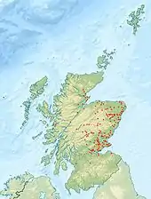 The confederation of Pictish tribes that developed north of the Firth of Forth may have stretched up as far as Orkney.[4] It probably developed out of the tribes of the Caledonii (whose name continued to be used for at least part of the confederation), perhaps as a response to the pressure exerted by the presence of the Romans to the south.[5] They first appear in Roman records at the end of the 3rd century as the picti (the painted people: possibly a reference to their habit of tattooing their bodies) when Roman forces campaigned against them. The first identifiable king of the Picts, who seems to have exerted a superior and wide-ranging authority, was Bridei mac Maelchon (r. c. 550–84). His power was based in the kingdom of Fidach, and his base was at the fort of Craig Phadrig, near modern Inverness.[5] After his death, leadership seems to have shifted to the Fortriu, whose lands were centred on Moray and Easter Ross and who raided along the eastern coast into modern England. Christian missionaries from Iona appear to have begun the conversion of the Picts to Christianity from 563.[6]