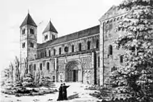 The first abbey church was built at the beginning of the 11th century. It was a three-aisled basilica with three apses. The only portion of this building to survive in full is its eastern end (the apses and the two flanking towers). Traces of the western wall have also been discovered, which indicate that the building was much shorter than the present structure, although of the same width.[8]