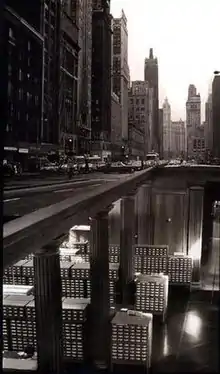 Some of his most famous works include a montage of fans using flashlights to illuminate Wrigley Field, which was then known for not having lights or night games; a photo of Michigan Avenue skyscrapers superimposed upon an image of the card catalogue at the University of Illinois Library; and a forest growing out of a parquet floor.[1]