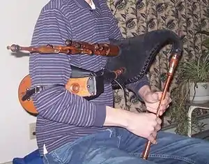 The Scottish smallpipe is a bellows-blown bagpipe re-developed by Colin Ross and many others, adapted from an earlier design of the instrument. There are surviving bellows-blown examples of similar historical instruments as well as the mouth-blown Montgomery smallpipes, dated 1757, which are held in the National Museum of Scotland.[1] Some instruments are being built as direct copies of historical examples,[2] but few modern instruments are directly modelled on older examples; the modern instrument is typically larger and lower-pitched. The innovations leading to the modern instrument, in particular the design of the reeds, were largely taken from the Northumbrian smallpipes.