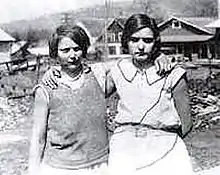 Two white women who were also aboard the train, Victoria Price and Ruby Bates, told a member of the posse that they had been raped by a group of black teenagers.[11] The posse brought the women to the jail where the accused were being held, and they identified them as their attackers. A doctor was summoned to examine Price and Bates for signs of rape, but none was found. A widely published photo showed the two women shortly after the arrests in 1931.