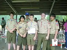 Scouts and adult leaders wear the Scout uniform.[13] It generally consists of a khaki button-up shirt, olive green pants or shorts, belt, socks, and optional neckerchief. The Scouter dress uniform is appropriate for professional Scouters and Scouting leaders on formal occasions.[14]