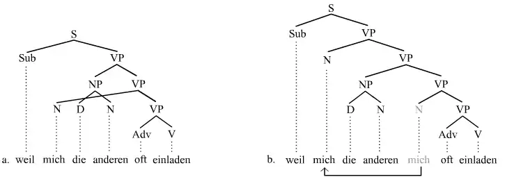 The theoretical analysis of scrambling can vary a lot depending on the theory of sentence structure that one adopts. Constituency-based theories (phrase structure theories) that prefer strictly binary branching structures are likely to address most cases of scrambling in terms of movement (or copying).[6] One or more constituents is assumed to move out of its base position into a derived position. Many other theories of sentence structure, for instance those that allow n-ary branching structures (such as all dependency grammars),[7] see many (but not all!) instances of scrambling involving just shifting; a discontinuity is not involved. The varying analyses are illustrated here using trees. The first tree illustrates the movement analysis of the example above in a theory that assumes strictly binary branching structures. The German subordinate clause weil mich die anderen oft einladen is used, which translates as 'because the others often invite me':