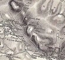 There are numerous other tumuli and long barrows in the area surrounding Scratchbury Camp, including some located on the adjacent and co-joined Cotley Hill to the southeast, and on Middle Hill to the west. On the crown of Cotley Hill is a further Bronze Age tumulus surrounded by an Iron Age enclosure.[1][3] Nearby to the northwest, on the side of Middle Hill, is the site of the deserted medieval village of Middleton, whose surviving earthworks consist of building platforms cut into lynchets and enclosed by a boundary bank and ditch, and a hollow-way.[25] There are also signs of strip lynchets immediately to the north of Scratchbury Camp on the side of the hill.[26] A Roman bronze spoon was found on or near Scratchbury Camp in 1804,[5] and a Roman urn was found in the surrounding area before 1856[27]