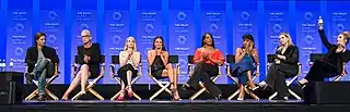 L–R : Brad Falchuk, Jamie Lee Curtis, Emma Roberts, Lea Michele, Niecy Nash, Keke Palmer, Abigail Breslin, Billie Lourd