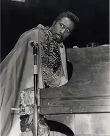 Soon after the release of "I Put a Spell on You", radio disc jockey Alan Freed offered Hawkins $300 to emerge from a coffin onstage.[18] Hawkins initially declined, reportedly saying "No black dude gets in a coffin alive – they don't expect to get out!"[23] However, he later relented and soon created an outlandish stage persona in which performances began with the coffin and included "gold and leopard-skin costumes and notable voodoo stage props, such as his smoking skull on a stick – named Henry – and rubber snakes."[18] These props were suggestive of voodoo, but also presented with comic overtones that invited comparison to "a black Vincent Price."[11][19] Despite the commercial success of the gimmick, Hawkins resented the schlock-factor that made him famous. He found it exploitative, and believed it undermined his sincerity as a vocalist and a balladeer. In a 1973 interview, he bemoaned the Screamin' epithet given to him by his label Okeh records, saying "If it were up to me, I wouldn't be Screamin’ Jay Hawkins...James Brown did an awful lot of screamin’, but never got called Screamin’ James Brown...Why can't people take me as a regular singer without making a bogeyman out of me?"[23]