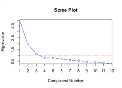 In multivariate statistics, a scree plot is a line plot of the eigenvalues of factors or principal components in an analysis.[1] The scree plot is used to determine the number of factors to retain in an exploratory factor analysis (FA) or principal components to keep in a principal component analysis (PCA). The procedure of finding statistically significant factors or components using a scree plot is also known as a scree test. Raymond B. Cattell introduced the scree plot in 1966.[2]