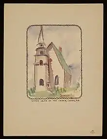 In 1945, Ames wrote a short memoir about Marsden Hartley. Set in the period at the end of his life when he lived in the home of a Maine lobsterman and his wife, it was written as if through the eyes of the wife, Katie Young, a long-term resident whose foreign birth set her apart from the other inhabitants of the tiny village of Corea, Maine. Ames had met Katie and her husband Forrest when she visited Hartley in the chicken-coop studio the Youngs had lent him.[49] After writing it, she kept the typed manuscript among her possessions until 1959 when she donated it to the Smithsonian Archives of American Art. The University of Maine press published the manuscript in 1972 as Marsden Hartley in Maine. The book was edited by Richard S. Sprague, an English professor at the university who was also responsible for acquiring the typescript and arranging for publication. The book had a forward by the art critic and historian Elizabeth McCausland and an afterward by Carl Sprinchorn, a Swedish-American artist known for paintings made in the North Maine Woods. Ames illustrated the work with line drawings and watercolors. One reviewer said the book was "not really about Hartley at all, though he is certainly a part of the tale. The book is really about friendship, about living and dying, and about how we respond to the death of a loved one.[50] Another reviewer wrote that "Miss Ames's prose is rarely pretentious, and it has always a pleasant flavor of her artist's eye as she sets the scene for Katie's own story. The drawings and watercolors are likewise simple, appropriately reflecting both the homeliness of Hartley's final residence and the sense of absence without him."[51] A watercolor of the church in Correa, shown above at right, is one of the book's illustrations.