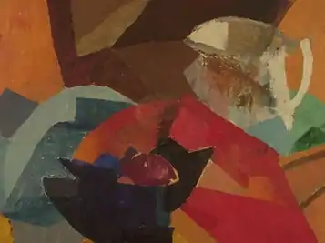 Ames showed a still life in the annual Society of Independent Artists exhibition of 1935. Noting that her painting was "interesting and promising", a critic praised its "especially notable" use of color.[6] The review did not name the painting. "Still Life #2"", shown above, no. 1, is an example of her still life work at the time. The next year, a critic for Art News called attention to a painting of hers called "The Gift" at a Salons of America exhibition, saying it ranked "as one of the more notable pictures" in that large and diverse show. In addition to the critic's review, the magazine included an image of the painting (shown above, no. 2).[7]