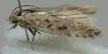 The wingspan is 12–14 mm (0.47–0.55 in).[3] Terminal joint of palpi as long as second. Forewings pale greyish-ochreous, sprinkled with dark fuscous and ochreous-whitish; stigmata dark fuscous, first discal rather beyond plical; a dark fuscous spot close beyond and slightly beneath second discal, sometimes confluent with it; an indistinct fine pale angulated fascia at 3/4, sometimes obsolete. Hindwings 1, whitish-grey, terminally darker. The larva is pale yellowish-green; dorsal line reddish; sides sometimes rosy-tinged; dots blackish-grey; head pale brownish-ochreous; plate of 2 blackish-brown.[4]