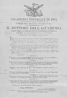 The Napoleonic decree of 18 October 1810, concerning "public education establishments" in Tuscany – a province of the French empire since 1807 – established an "Academic student residence" in Pisa for university students. Twenty-five places were made available for students of the Faculties of Arts and Sciences, to create a branch of the Parisian École Normale Supérieure in countries where the use of the Italian language was authorized.[6]