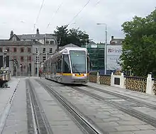 After the Frank Sherwin Bridge was opened nearby in the 1980s, Seán Heuston Bridge was no longer used to carry road traffic.[4] It was restored in 2003 and now carries Luas tram traffic on the red line.[6]