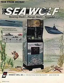 Sea Wolf is a shooter video game manufactured by Midway, originally released for arcades in 1976.[3] It is a video game update of an earlier coin-operated electro-mechanical Midway game, Sea Devil,[4] itself based on Sega's 1966 coin-op electro-mechanical arcade submarine simulator Periscope.[5] The game was released in Japan by Taito.[1] Sea Wolf was designed by Dave Nutting. The game sold 10,000 arcade cabinets, and was the highest-grossing arcade video game of 1976 and 1977 in the United States, and Japan's fifth highest-grossing arcade video game of 1976.