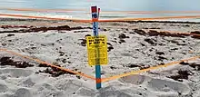 The mature nesting female hauls herself onto the beach, nearly always at night, and finds suitable sand in which to create a nest. Using her hind flippers, she digs a circular hole 40 to 50 centimetres (16 to 20 in) deep. After the hole is dug, the female then starts filling the nest with her clutch of soft-shelled eggs. Depending on the species, a typical clutch may contain 50–350 eggs. After laying, she re-fills the nest with sand, re-sculpting and smoothing the surface, and then camouflaging the nest with vegetation until it is relatively undetectable visually.[23] She may also dig decoy nests.[28] The whole process takes 30 to 60 minutes. She then returns to the ocean, leaving the eggs untended.[29]