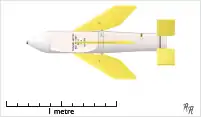 The Seacat is a small, subsonic missile powered by a two-stage solid fuel rocket motor. It is steered in flight by four cruciformly arranged swept wings and is stabilised by four small tail fins. It is guided by command line-of-sight (CLOS) via a radio-link; i.e., flight commands are transmitted to it from a remote operator with both the missile and target in sight.[4] In some senses it was no more than an initially unguided subsonic rocket that took the controller about 7 seconds, or 500 yards flight time to acquire and lock onto radar tracking and optical direction, making it unsuitable for close in AA defence.[5]