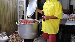 The Maryland Crab Feast ("Crab Boil" is not a phrase used in Maryland, as is in Louisiana) is a popular event for small groups of friends. The cooking technique is steaming rather than boiling, but the event is similar enough. Crab pots have a raised bottom that keeps a fitted basket above the liquid. A couple of inches of beer (or water) mixed with vinegar is brought to a boil. The crabs are placed in the basket and sprinkled liberally with a seasoning mix (usually Old Bay), and then placed in the steamer. Twenty minutes later the bright red crabs are pulled up and turned out onto trays or platters. Tables are covered with layers of brown paper and wooden mallets and serrated knives are made available for cracking claws and picking out meat. Typical side dishes are cole slaw and corn on the cob.[4]