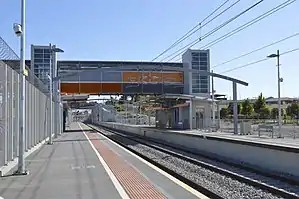 The station has two side platforms connected via an overhead walkway. Lifts and stairs enable passengers to move between the walkway and the platforms. A 550 space park & ride area is provided, as well as a kiss & ride facility. A train stabling depot and maintenance facility has been provided adjacent to the station.[5]