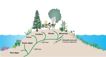 Terrestrial plants evolved perhaps as early as 450 million years ago from a group of green algae.[12] Seagrasses then evolved from terrestrial plants which migrated back into the ocean.[13][14] Between about 70 million and 100 million years ago, three independent seagrass lineages (Hydrocharitaceae, Cymodoceaceae complex, and Zosteraceae) evolved from a single lineage of the monocotyledonous flowering plants.[15]