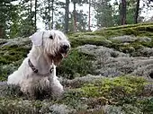 They have a white double coat which requires regular brushing with a wire comb in order to prevent matting.[19] It has a dense undercoat, while the outer coat is wiry and weather resistant.[20] Markings on the face can be in a variety of colours including lemon, black, brown, blue, and badger, which is a mix of brown and black.[21] Heavy body markings or patches or excessive ticking on the coat are discouraged.[21] Sealyhams are low to the ground, and in muddy weather their long coats can become quite dirty.[3] Sealyham coats are groomed by hand stripping, in order to keep the coat from becoming too soft. However, if they are not shown, Sealyhams can be clipped and this is often the preferred grooming approach for pets. As with many terriers, Sealyhams have essentially non-shedding coats.[22]