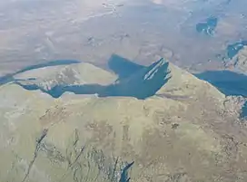 ![]() Seana Bhràigh from the south with Cadha Dearg in the foreground and Creag an Duine at centre. The summit is at left. | |