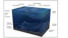 Progress in the ecological understanding of spatial patterning was not confined to shallow seafloor environments. For the open ocean, advances in ocean observing systems since the 1970s have allowed scientists to map, classify, quantify and track dynamic spatial structure in the form of eddies, surface roughness, currents, runoff plumes, ice, temperature fronts and plankton patches using oceanographic technologies – a theme increasingly referred to as pelagic seascape ecology.[19][20][21] Subsurface structures too, such as internal waves, thermoclines, haloclines, boundary layers and stratification resulting in distinct layering of organisms, is increasingly being mapped and modelled in multiple dimensions.