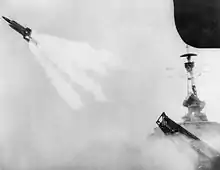 Continual tests took place over the next four years using both the Clausen Rolling Platform at RAE Aberporth and the Girdle Ness. A final series of tests at sea, which culminated in sixteen successful firings, finally cleared the missile for service in 1961.[20] After more than 250 launches, the Seaslug Mark 1, also known as Guided Weapon System 1, or GWS.1, finally entered service in 1962 on County-class, each fitted with a single twin missile launcher and a complete weapon system with one fire control set and 30 missiles. The Seaslug-armed cruisers were cancelled in 1957.[21]