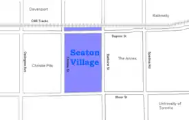 Seaton Village is a neighbourhood and former village located west of Downtown Toronto in Toronto, Ontario, Canada. It is named after John Colborne, 1st Baron Seaton, Lieutenant-Governor of Upper Canada from 1828 to 1836. Seaton Village is bordered by Bloor Street to the south, the Canadian Pacific Railway tracks to the north, Christie Street to the west, and Bathurst Street to the east. Officially, it is an enclave within The Annex neighbourhood, as defined by the City of Toronto. It is sometimes referred to as the West Annex. While Seaton Village shares several characteristics with the Annex (notably its architecture and its popularity with University of Toronto students), it is often perceived as a quieter, family-oriented neighbourhood with smaller, less expensive homes. The Koreatown shopping district is at its southern border.