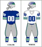 When the Seahawks debuted in 1976, the team's logo was a stylized royal blue and forest green osprey's head based on Kwakwakaʼwakw art masks.[66] The helmet and pants were silver while the home jerseys were royal blue with white and green sleeve stripes and white numerals and names. The road jersey was white, with white, blue and green sleeve stripes and had blue numerals and names. The socks were blue and had the same green and white striping pattern seen on the blue jerseys. Black shoes were worn for the first four seasons, one of the few NFL teams that did so in the late 1970s, at a time when most teams were wearing white shoes. They would switch to white shoes in 1980.[67]