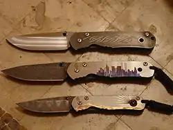 First introduced in 1990, the current basic model has a sand-blasted titanium handle and a stonewashed finish CPM S35VN steel blade.[5] There are numerous options for the embellishment of the Sebenza's titanium handles, such as computer-generated graphics, custom (unique) graphics, or inlays such as exotic wood, micarta, or mammoth ivory. Originally the Chris Reeve Sebenza was available with a blade of ATS-34 steel.[4] In 1996, the blade material was changed to BG-42 blade steel, and later in 2001, the Sebenza blade material transitioned to CPM S30V steel. CPM S30V was developed by Crucible Steel with the collaboration of Chris Reeve.[5] Damascus steel blades are also available as an option on the Sebenza. Since 2012, all Chris Reeve knives have transitioned to CPM S35VN steel. A feature of the Sebenza that is highly praised by users is the ease of maintenance, as CRK actually encourages the customer to disassemble and maintain the knife by including a hex wrench, as well as small tube of fluorinated grease (to lubricate the pivot) and a tube of Loctite (for screws) in the box. Another feature of the Sebenza is the use of a bushing system around the blade's pivot that keeps the blade at a constant tight fit which is always centered. This bushing allows the user to tighten the pivot screw completely without having to manually adjust the pivot tension.