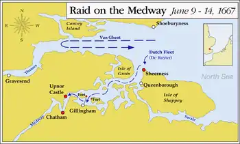 In June, De Ruyter, with Cornelis de Witt supervising, launched the Dutch raid on the Medway at the mouth of the River Thames. After capturing the fort at Sheerness, the Dutch fleet went on to break through the massive chain protecting the entrance to the Medway and, on the 13th, attacked the laid up English fleet.