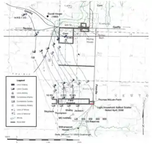 The Union troopers then moved up to the northern edge of the McClain Farm with four cavalry regiments in a line from left to right in the order of the 16th Kansas Cavalry, the 3rd Wisconsin Cavalry Regiment, the 2nd Colorado Cavalry, and the 15th Kansas Cavalry Regiment; McLain's Battery formed up in a supporting position with four Parrott rifles.[24][25] Shelby deployed his men 500 yards (460 m) away on the other side of the farm, with the brigades of Thompson and Colonel Sidney D. Jackman in the center and two small mounted detachments covering the flanks.[24] Slayback's Missouri Cavalry Battalion and the 5th Missouri Regiment were positioned between Thompson's main body and the mounted group on the Confederate left.[26] The two guns of Collins's Missouri Battery provided artillery support; and was in turn supported by Nichols's Missouri Cavalry Regiment and Hunter's Missouri Cavalry Regiment.[27] The modern historian Charles D. Collins Jr. estimates that Shelby's division fielded about 1,500 to 2,000 men at Newtonia,[24] while the historian Mark A. Lause states that no more than 3,500 to 4,000 Confederates would have fought in the battle.[28] The two sides' artillery opened fire, Collins's Battery having the early advantage over McLain, whose pieces had trouble finding the range of the Confederates.[29] The distance between the two units was great enough that small arms fire was not attempted in large-scale, and what was shot had essentially no effect.[19][30] Either two[29] or four[31] mountain howitzers were added to the Union line by Hoyt; they were more effective than McLain's pieces, but could not gain an advantage over Collins. Fearing that the Union guns' numerical advantage would eventually overwhelm Collins,[29] Shelby ordered an attack, which outflanked the Union line and had initial success.[18] The Union soldiers fell back about 200 yards (180 m).[25] Only Thompson's brigade participated in the attack, as Jackman's men were left behind to support Collins's battery.[21] Colonel Moses W. Smith, commander of the 11th Missouri Cavalry Regiment, suffered a mortal wound during the charge.[21][32]