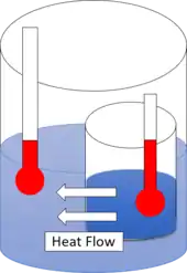 The first law of thermodynamics provides the definition of the internal energy of a thermodynamic system, and expresses its change for a closed system in terms of work and heat.[7] It can be linked to the law of conservation of energy.[8] The second law is concerned with the direction of natural processes.[9] It asserts that a natural process runs only in one sense, and is not reversible. For example, when a path for conduction and radiation is made available, heat always flows spontaneously from a hotter to a colder body. Such phenomena are accounted for in terms of entropy change.[10][11] If an isolated system containing distinct subsystems is held initially in internal thermodynamic equilibrium by internal partitioning by impermeable walls between the subsystems, and then some operation makes the walls more permeable, then the system spontaneously evolves to reach a final new internal thermodynamic equilibrium, and its total entropy, S, increases.