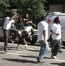 The Second Line is a tradition in parades organized by Social Aid and Pleasure Clubs (SAPCs) with brass band parades in New Orleans, Louisiana, United States. The "main line" or "first line" is the main section of the parade, or the members of the SAPC with the parading permit as well as the brass band. The Second Line consists of people who follow the band to enjoy the music, dance, and engage in "community." The Second Line's style of traditional dance, in which participants dance and walk along with the SAPCs in a free-form style with parasols and handkerchiefs, is called "second-lining". It is one of the most foundationally Black American-retentive cultures in the United States.[1] It has been called "the quintessential New Orleans art form – a jazz funeral without a body".[2] Another significant difference from jazz funerals is that Second Line parades lack the slow hymns and dirges played at funerals (although some organizations may have the band play a solemn selection toward the start of the parade in memory of members who died since their last parade).