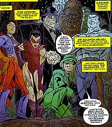First organized by Darkseid, the Secret Society of Super Villains were based in the Sinister Citadel in San Francisco. From early on, the team was plagued with power struggles. Lex Luthor, the Wizard, Gorilla Grodd, and Funky Flashman all sought to control the powerful team; the Manhunter (the team's first leader) and Captain Comet, on the other hand, sought to divert the villains' evil ways into a more positive channel.[7] After discovering the true identity of their benefactor, the team rebelled against the alien overlord. To quash their uprising, Darkseid sent Mantis and Kalibak. At the end of the struggle, the Manhunter sacrificed himself to seemingly kill Darkseid. After this, the team splintered, with Luthor, the Wizard, Gorilla Grodd and Flashman leading the team at different times. However, the Wizard proved to be the most tenacious and created the definitive incarnation of the SSoSV. They went on to fight the original Crime Syndicate of America of Earth-Three and the Justice Society of America. While traveling between dimensions, back on Earth-1 the Silver Ghost, the Mirror Master and the Copperhead formed yet another team and fought the Freedom Fighters.[8]