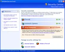 Microsoft learned from discussions with customers that there was confusion as to whether users were taking appropriate steps to protect their systems, or if the steps they were taking were effective.[2] From this research, Microsoft made the decision to include a visible control panel with Windows XP Service Pack 2 that would provide a consolidated view of the most important security features. Service Pack 2, released in August 2004, includes the first version of Windows Security Center (WSC). This version monitors Windows Update, Windows Firewall, and the availability of an anti-virus program. Third-party providers of personal firewall and anti-virus software packages were encouraged to use WSC API to register their products with WSC.