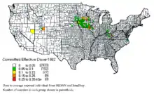 The Sedan shot resulted in a radioactive cloud that separated into two plumes, rising to 3.0 km and 4.9 km (10,000 ft and 16,000 ft). The two plumes headed northeast and then east in roughly parallel paths towards the Atlantic Ocean. Nuclear fallout was dropped along the way, narrowly dispersed in a relatively small number of United States counties.[3] Detected radioactivity was especially high in eight counties in Iowa and one county each in Nebraska, South Dakota and Illinois. The most heavily affected counties were Howard, Mitchell and Worth counties in Iowa as well as Washabaugh County in South Dakota, an area that has since been incorporated into Jackson County and is wholly within the Pine Ridge Indian Reservation. These four counties measured maximum levels higher than 6,000 microcuries per square meter (220 MBq/m2).[9]