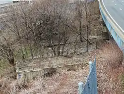 The station was built extending from the tunnel entrance to Jerome Avenue on the side of a cliff on a steel structure spanning the tracks of Metro-North's Hudson Line that connected to the existing Putnam Bridge, which had been built for the New York City and Northern Railroad. The station street entrance and mezzanine was above the tracks on Sedgwick Avenue. The west end of the platforms on the steel structure were constructed of wood. The east end of the concrete platforms extended into the tunnel for about a car length. A connecting passageway and stairways from the west end of the northbound platform led to the platforms on the New York Central Hudson Division tracks to permit transfers to that division's trains.[4] The station site, in 2010, has ruins of the platforms and the track-bed into the tunnel entrance on Sedgwick Avenue.