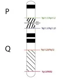 The pericentromeric region on the Y chromosome is a 450kb euchromatin island between the satellite three sequence and the long arm of the chromosome. Whole genome assembly comparison experiments revealed that 80.2% of the pericentromeric sequence of the Y chromosome is composed of segmental duplications with 73.8% and 5.3% of the DNA duplicated interchromosomally and intrachromosomally respectively. It is estimated that it has a recent origin to within the last thirty million year of primate evolution.[4] Further FISH testing confirms that the segment is highly duplicated and that the majority of the signals is located near the centromeric region of the chromosome.[4][6] In addition, the pericentromeric Yq11 region shares long stretches of sequence with chromosomes 1, 2, 3, 10, 16, and 22. For this same region, thirty-six modules are distributed interchromosomally while only one module is distributed intrachromosomally. There are twenty genes segments on the Yq11 region and thirteen of them are believed to not be functional genes. Eight of these gene segments display features of degenerated processed pseudogenes while five of them display partial exon-intron structure.[4]