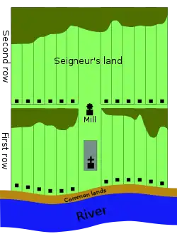 To maximize simplicity when surveying, estates in villein socage were almost invariably distributed in rectangular plots following a rowed system, wherein the first row bordered the river, and was the first to be filled, followed by the second behind it and so on. Typically, the proportions of such rectangles coincided with the ratio of 1:10 for width and length, respectively. However, extremes all the way up to 1:100 are known to have occurred.[12] This method of land division confers obvious advantages in terms of easy access to transportation and cheap surveying, but also allowed socagers to live remarkably close to families on neighboring plots—often within a few hundred yards—creating something of a proto-neighborhood.[13]
