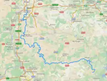 It originates near Azoudange, in the department of Moselle. Leaving the Lindre lake, it skirts the town of Dieuze, and traverses Vic-sur-Seille and Nomeny, before flowing into the Moselle at Metz. It is 138 km long,[1] and has a basin area of 1348 km2. Most of its length is in the department of Moselle, except for the part between Aulnois-sur-Seille and Cheminot, which is in Meurthe-et-Moselle. The Seille also forms the border between Moselle and Meurthe-et-Moselle from Chambrey to Aulnois-sur-Seille.