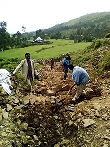 The tabia holds several exclosures, areas that are set aside for regreening,[10] such as Khunale exclosure. Wood harvesting and livestock range are not allowed there. Besides effects on biodiversity,[11][12][13] water infiltration, protection from flooding, sediment deposition,[14] carbon sequestration,[15] people commonly have economic benefits from these exclosures through grass harvesting, beekeeping and other non-timber forest products.[16] The local inhabitants also consider it as “land set aside for future generations”.[17]