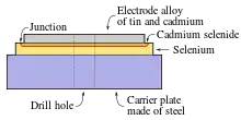The rectifying properties of selenium, amongst other semiconductors, were observed by Braun, Schuster and Siemens between 1874 and 1883.[2] The photoelectric and rectifying properties of selenium were also observed by Adams and Day in 1876[3] and C. E. Fitts around 1886, but practical rectifier devices were not manufactured routinely until the 1930s. Compared with the earlier copper-oxide rectifier, the selenium cell could withstand higher voltage, but at a lower current capacity per unit area.[4]