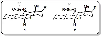 The reaction is highly trans-selective when acyclic α-phenylseleno carbonyl compounds are employed. Formation of conjugated double bonds is favored. Endocyclic double bonds tend to predominate over exocyclic ones, unless no syn hydrogen is available in the ring. Selenium in these reactions is almost always stereogenic, and the effect of epimerization at selenium (which is acid-catalyzed and occurs readily) on the elimination reaction is nearly unknown. In one example, separation and warming of selenoxides 1 and 2 revealed that 2 decomposes at 0 °C, while 1, which presumably has more difficulty accessing the necessary syn conformation for elimination, is stable to 5 °C.[6]