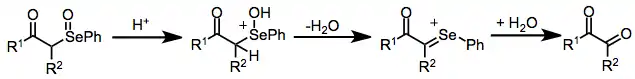 A second significant side reaction in reactions of ketones and aldehydes is selanylation of the intermediate selenoxide. This process leads to elimination products retaining a carbon-selenium bond,[16] and is more difficult to prevent than the seleno-Pummerer reaction. Tertiary selenoxides, which are unable to undergo enolization, do not react further with selenium electrophiles.
