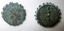 Certain Seleucid bronze coinage have serrated edges,[8] otherwise rare in ancient coins.[9] They are sometimes called bottle cap coins.[18] Seleucid mints struck this type of bronze coinage within an approximate period of 187 BC–141 BC. This period was between reigns of Seleucus IV and Antiochus VI.[8][9]