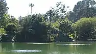 For a period of time hence, the property was utilized as a sand, rock, and gravel quarry before it was later purchased by Los Angeles real-estate magnate Alphonzo Bell, Sr.[16] In 1927, the surrounding hillsides were hydraulically graded to fill the canyon, with the intention to completely level it for future development. However, the earth-moving project was never completed, which left a large basin in an unleveled portion of the canyon that subsequently filled to a depth of 20 ft (6.1 m) with water from four (hot and cold) springs within the vicinity.[17] The 2.5-acre water body (10,000 m2)[18] became known as Lake Santa Ynez; the only natural spring-fed lake within the City of Los Angeles.[19][20]