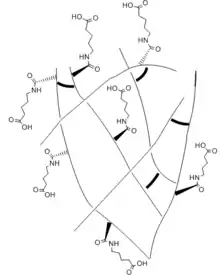 A dangling side chain is a hydrocarbon chain side chains that branch off of the backbone of the polymer. Attached to the side chain are polar functional groups. The side chains "dangle" across the surface of the hydrogel, allowing it to interact with other functional groups and form new bonds.[7] The ideal side chain would be long and flexible so it could reach across the surface to react, but short enough to minimize steric hindrance and collapse from the hydrophobic effect.[7] The side chains need to keep both the hydrophobic and hydrophilic effects in balance. In a study performed by the University of California San Diego to compare healing ability, hydrogels of varying side chain lengths with similar crosslinking contents were compared and the results showed that healing ability of the hydrogels depends nonmonotonically on the side chain length.[7] With shorter side chain lengths, there is limited reach of the carboxyl group which decreases the mediation of the hydrogen bonds across the interface. As the chain increases in length, the reach of the carboxyl group becomes more flexible and the hydrogen bonds can mediated. However, when a side chain length is too long, the interruption between the interaction of the carboxyl and amide groups that help to mediate the hydrogen bonds. It can also accumulate and collapse the hydrogel and prevent the healing from occurring.
