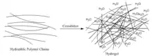 Crosslinking is the process of joining two or more polymer chains. Both chemical and physical crosslinking exists. In addition, both natural polymers such as proteins or synthetic polymers with a high affinity for water may be used as starting materials when selecting a hydrogel.[2] Different crosslinking methods can be implemented for the design of a hydrogel. By definition, a crosslinked polymer gel is a macromolecule that solvent will not dissolve. Due to the polymeric domains created by crosslinking in the gel microstructure, hydrogels are not homogenous within the selected solvent system. The following sections summarize the chemical and physical methods by which hydrogels are crosslinked.[2]